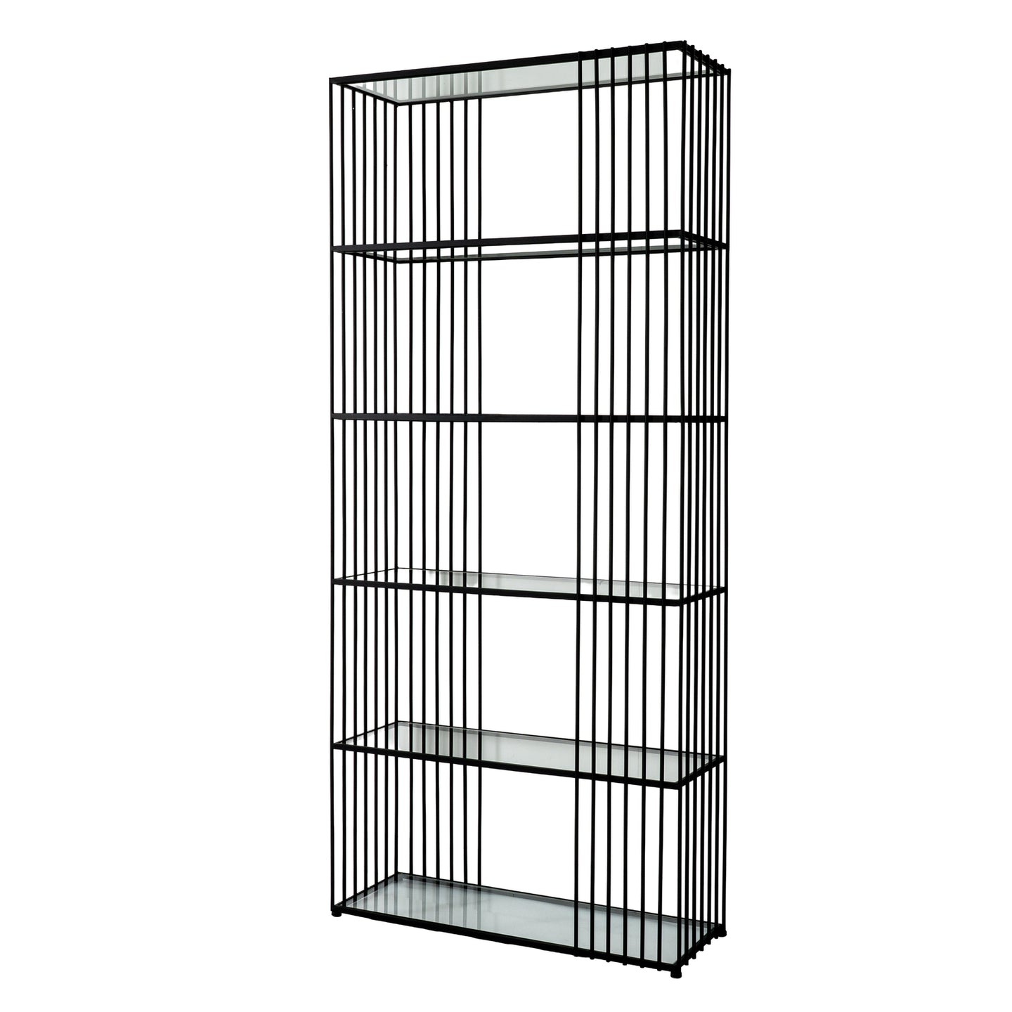 The Alto Shelf Unit with glass shelves features a tall, open-frame design that offers a sleek and practical display solution. The clear glass shelves sit within a sturdy metal frame finished for a clean, modern look, creating balance and structure in any room. Its linear geometry enhances visual order, making it ideal for showcasing collections or products.